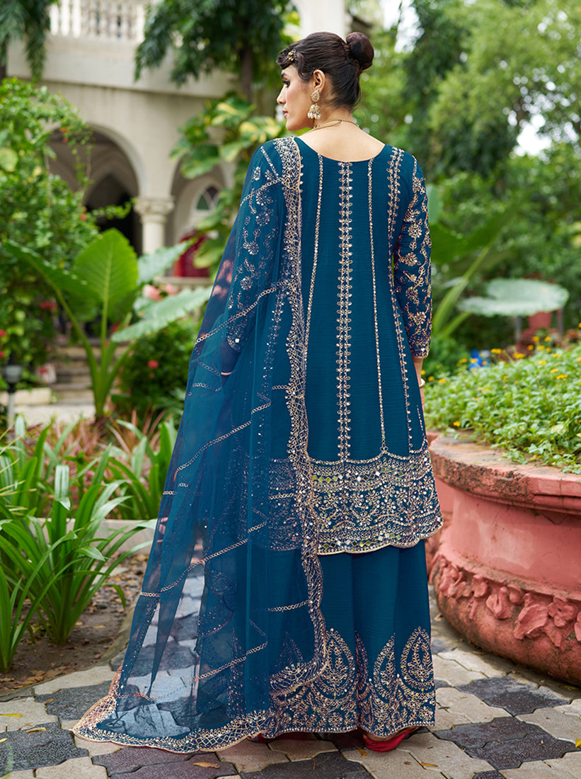Peacock Blue Embroidered Chinnon Readymade Palazzo Suit